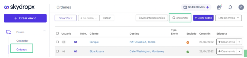 6. Cuando tu tienda esté conectada a la plataforma, ve a Órdenes y por esta ocasión sincroniza manualmente las órdenes recientes. A partir de esta acción, tus órdenes se comenzarán a sincronizar automáticamente.