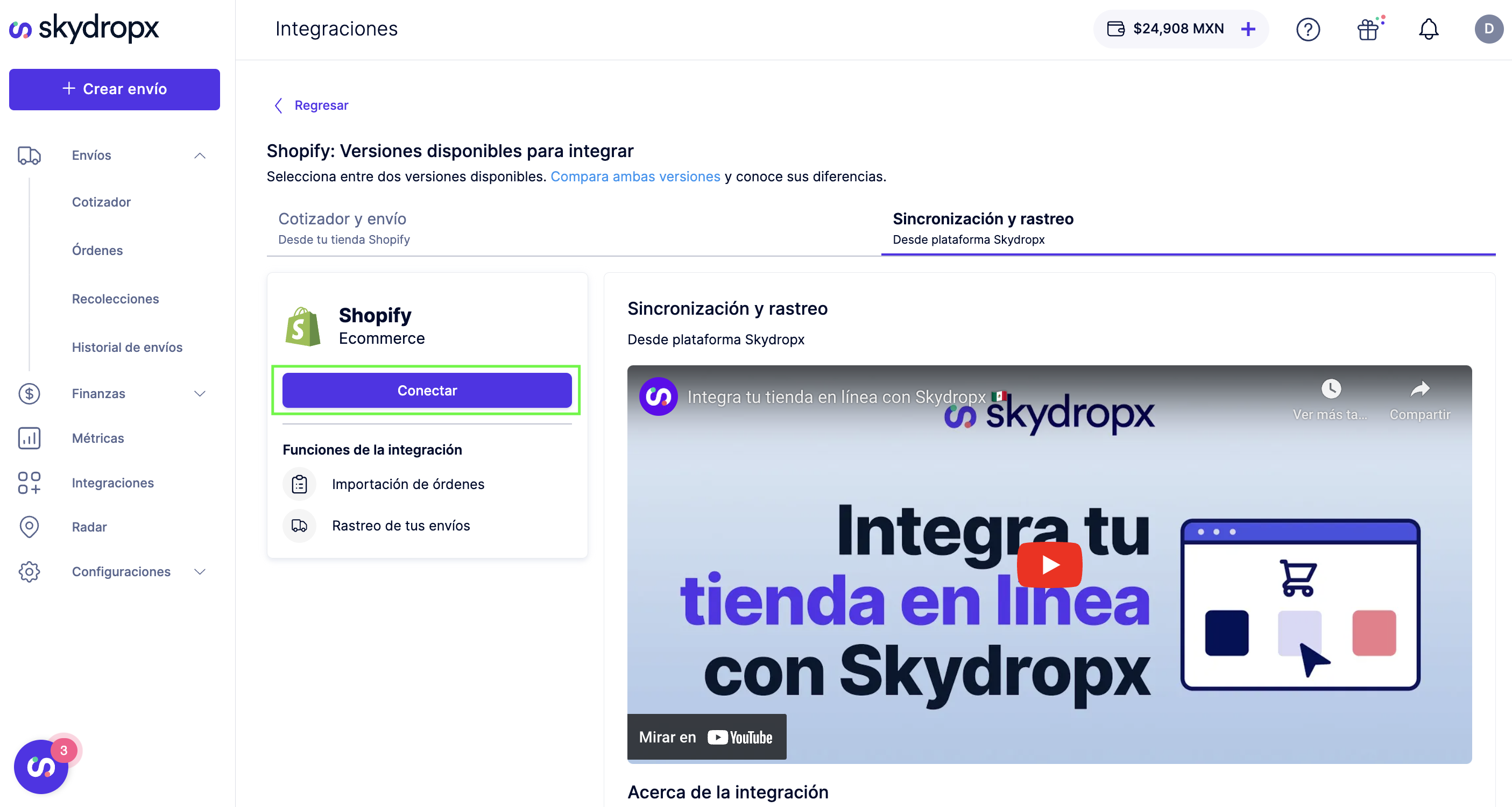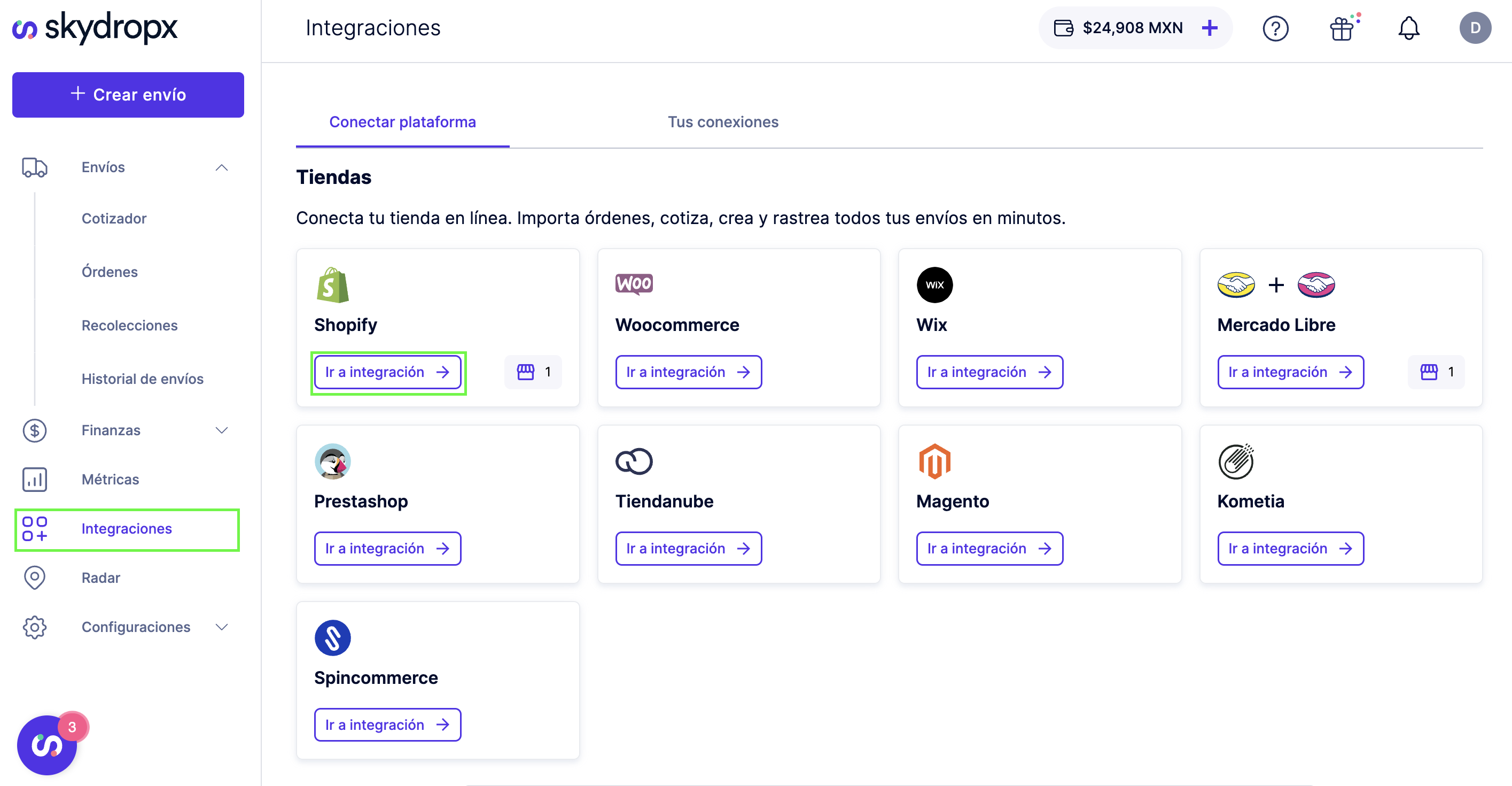 1. Dentro de Skydropx, dirígete a “Tus conexiones” en la sección “Integraciones”.