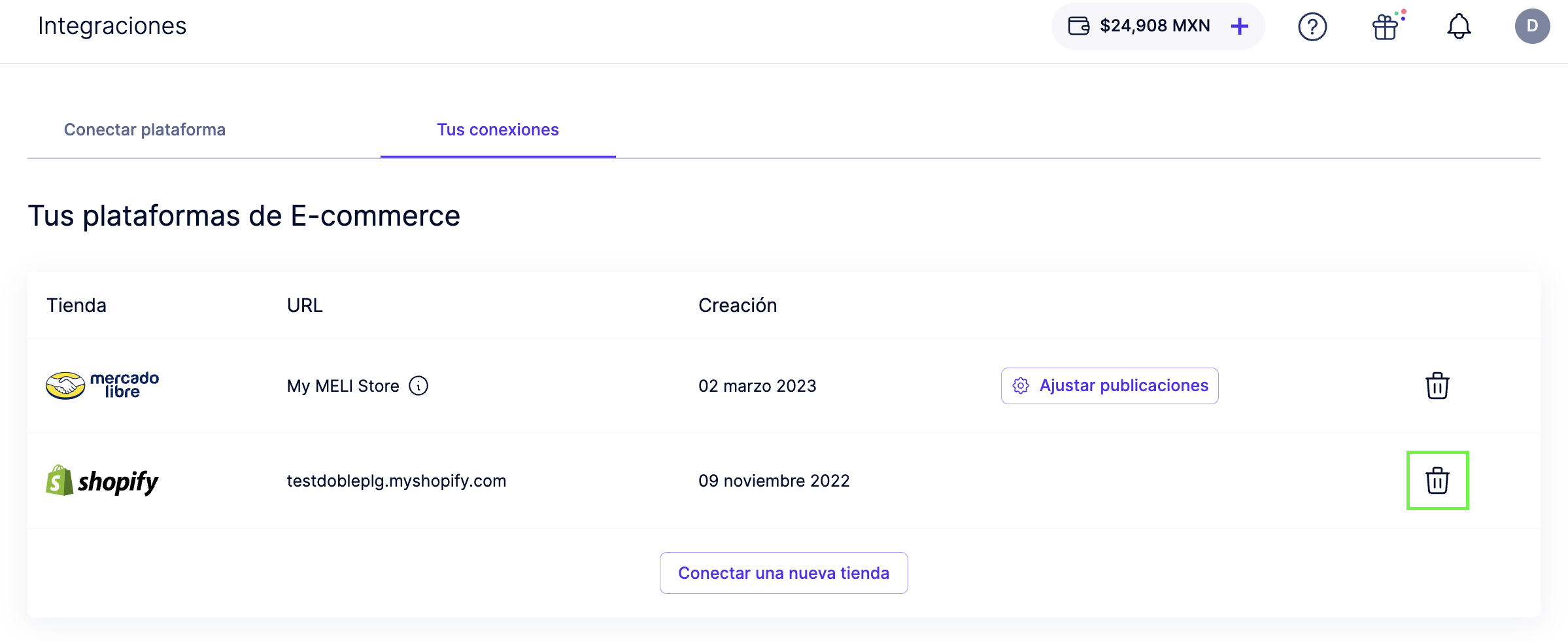 2. Encuentra la integración de tu tienda y haz clic en el ícono “Borrar” para eliminar la integración con Shopify.